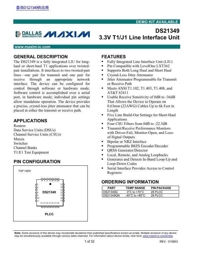 MAXIM DS21349 3.3V T1/J1 Line Interface Unit 数据手册.pdf