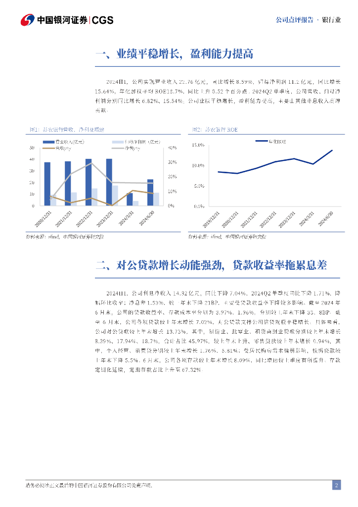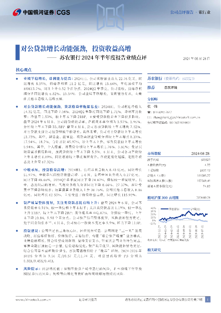 中国银河:苏农银行2024年半年度报告业绩点评:对公贷款增长动能强劲,投资收益高增.pdf