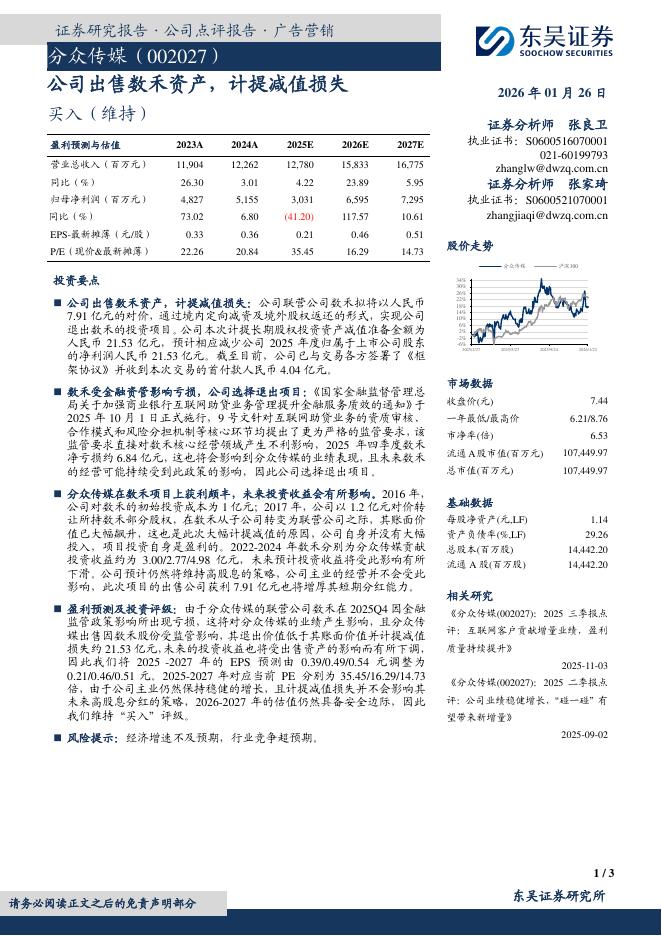 东吴证券:分众传媒(002027)-公司出售数禾资产,计提减值损失.pdf