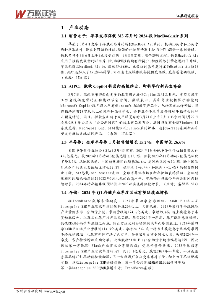 万联证券:电子行业周观点:行业巨头持续加码AIPC,存储产业营收有望保持增长.pdf