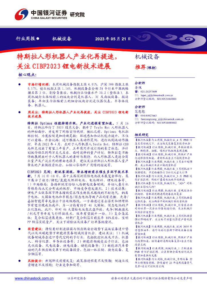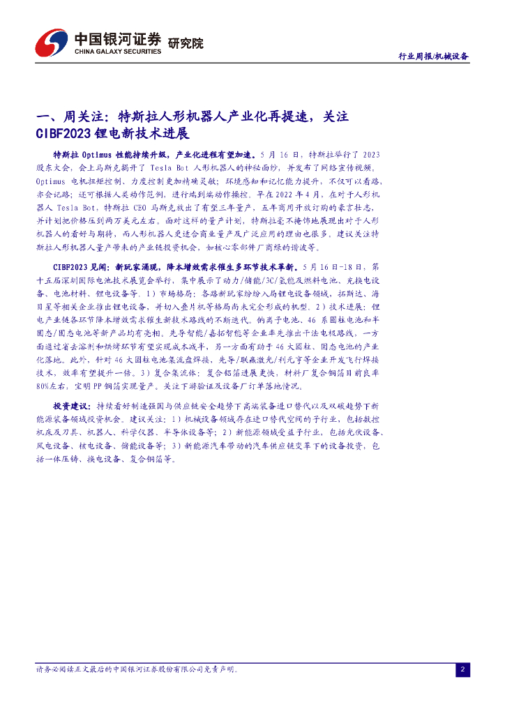 中国银河:机械设备行业周报:特斯拉人形机器人产业化再提速,关注CIBF2023锂电新技术进展.pdf