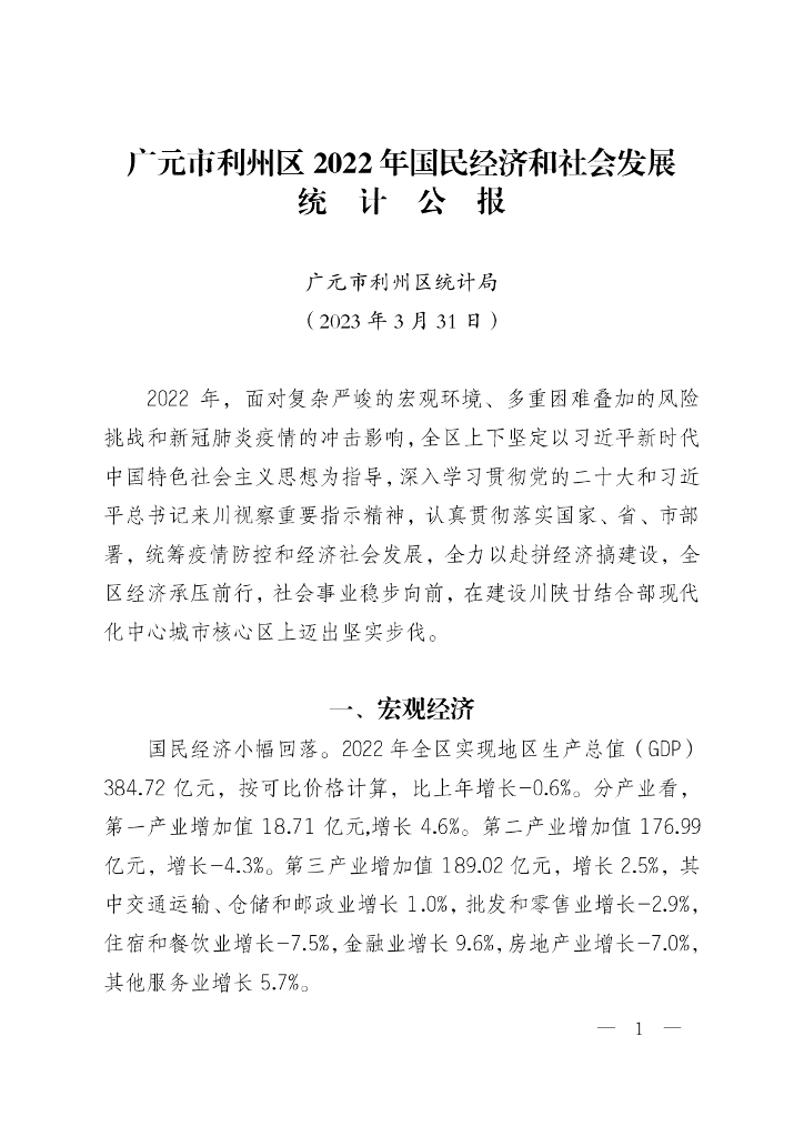 广元市利州区2022年国民经济和社会发展统计公报.pdf