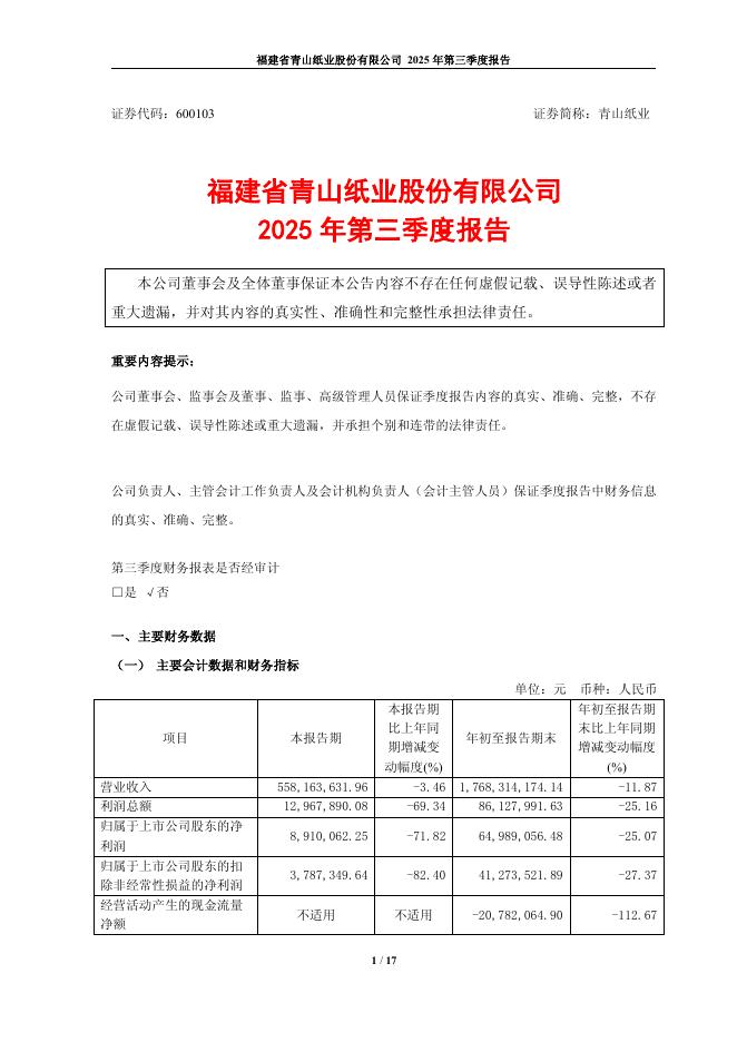 600103-青山纸业:2025年第三季度报告.pdf