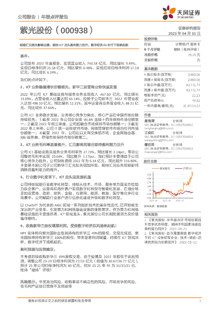 天风证券:紫光股份(000938)-短期汇兑损失影响业绩,期待ICT龙头盈利能力回升,数字经济/Ai时代下扬帆起航.pdf