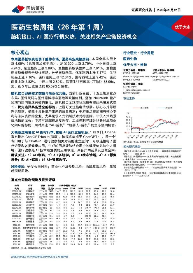 国信证券:医药生物行业周报(26年第1周):脑机接口、AI医疗行情火热,关注相关产业链投资机会.pdf