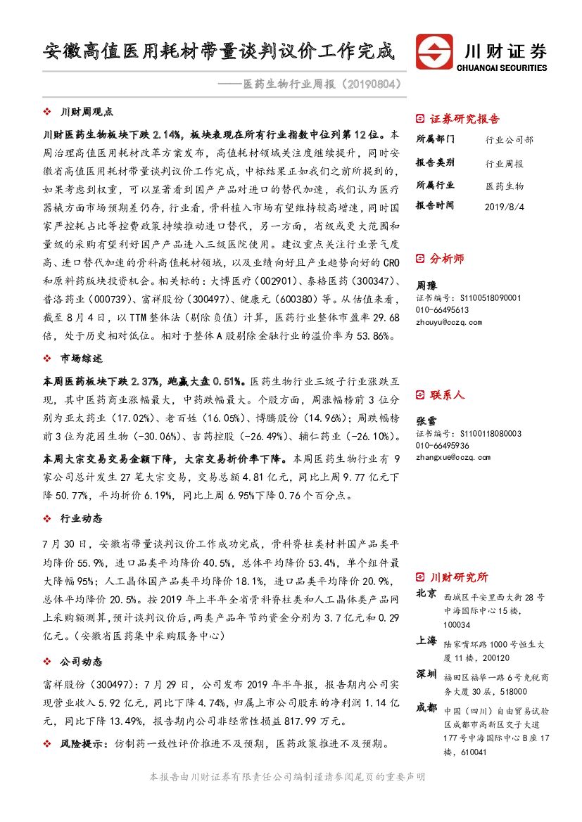 川财证券:医药生物行业周报:安徽高值医用耗材带量谈判议价工作完成.pdf