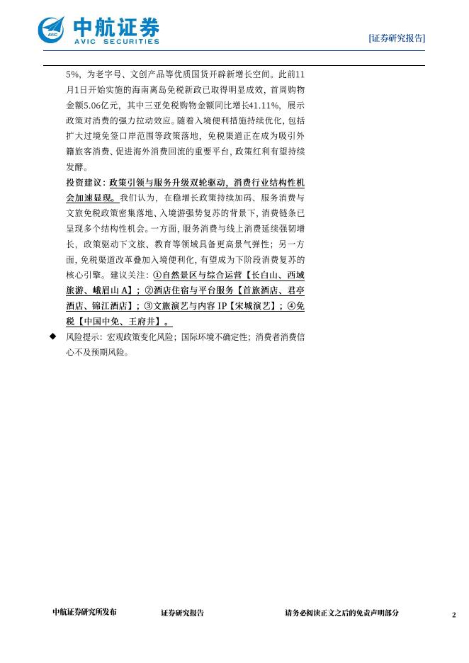 中航证券:社会服务行业·周观点:离岛免税政策系统优化,封关前消费红利加速释放