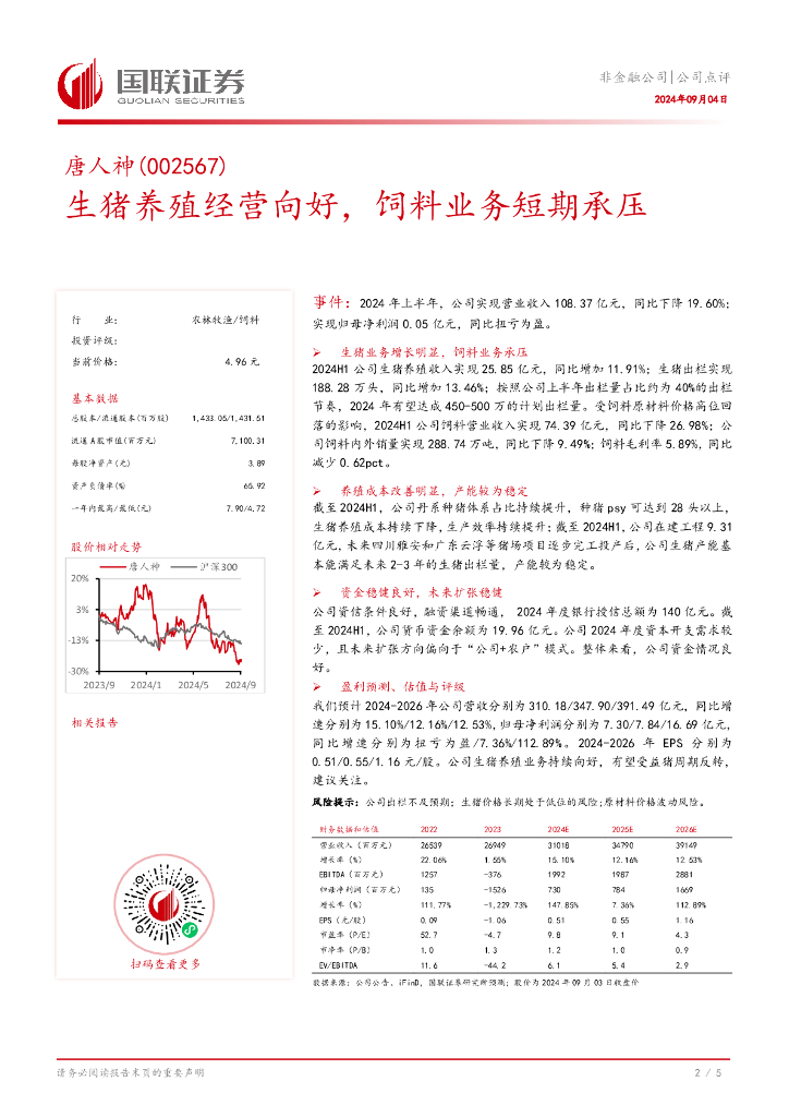 国联证券:唐人神(002567)-生猪养殖经营向好,饲料业务短期承压.pdf