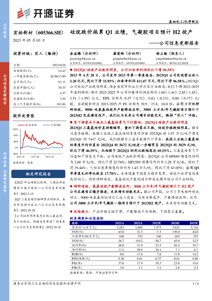 开源证券:宏柏新材(605366)-公司信息更新报告:硅烷跌价拖累Q1业绩,气凝胶项目预计H2投产.pdf