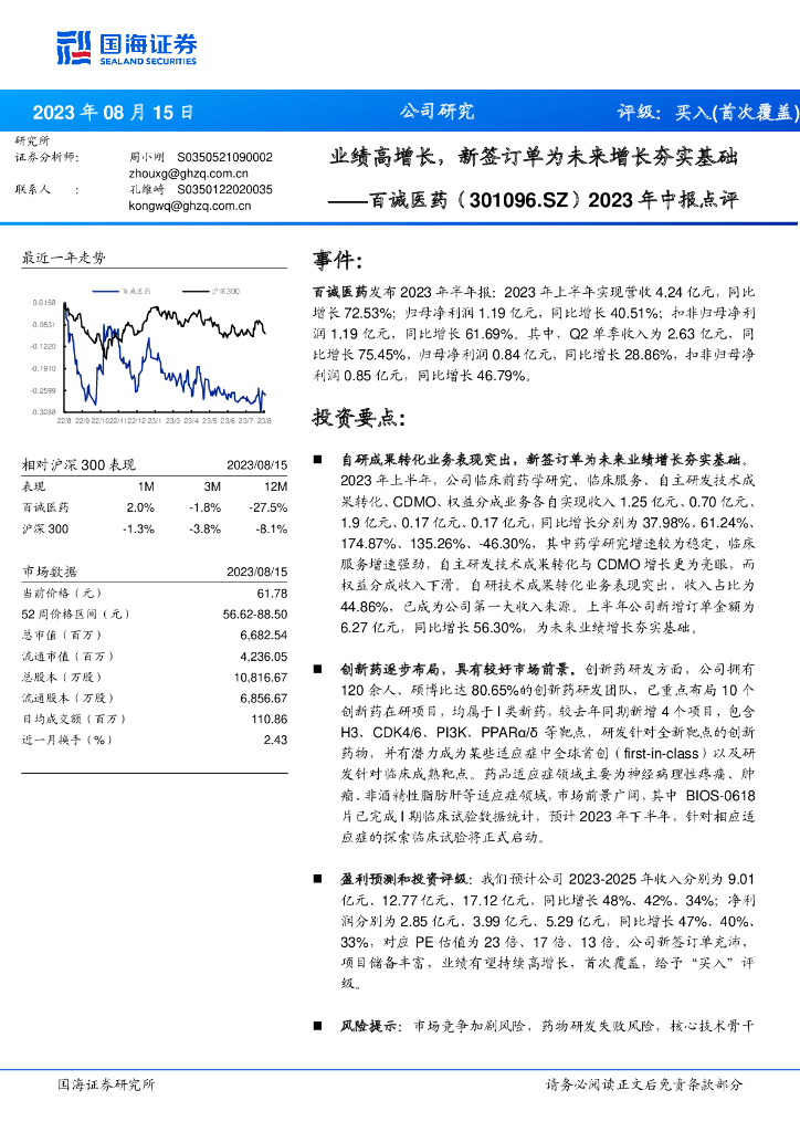 国海证券:百诚医药(301096)-2023年中报点评:业绩高增长,新签订单为未来增长夯实基础.pdf