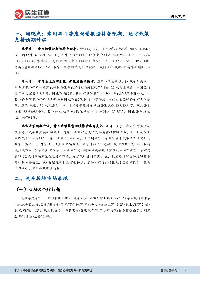 民生证券:汽车周报:1Q19乘用车销量数据符合预期,地方政策支持预期升温.pdf