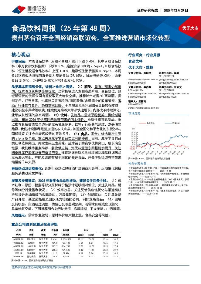国信证券:食品饮料行业周报(25年第48周):贵州茅台召开全国经销商联谊会,全面推进营销市场化转型.pdf