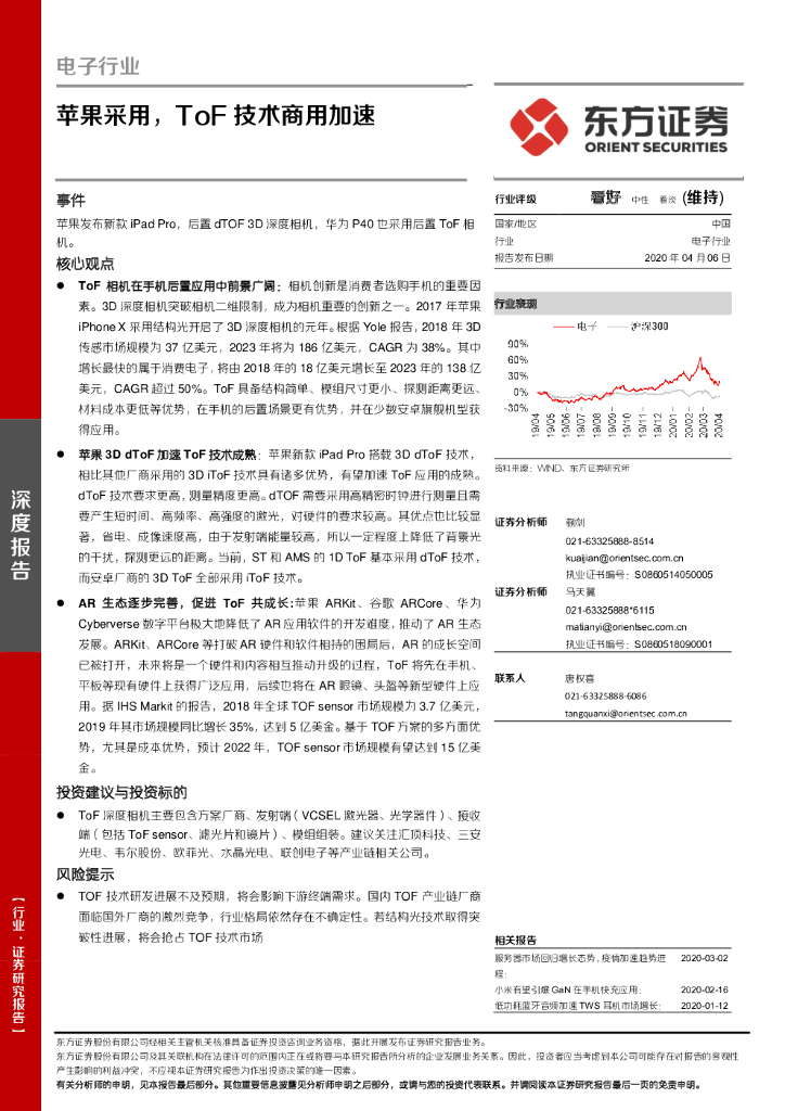 东方证券:电子行业:苹果采用,ToF技术商用加速.pdf