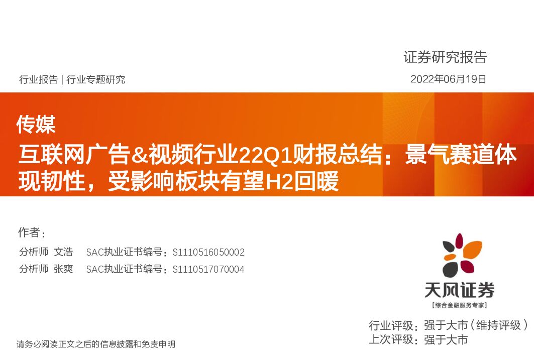 天风证券:传媒行业专题研究:互联网广告&视频行业22Q1财报总结:景气赛道体现韧性,受影响板块有望H2回暖.pdf