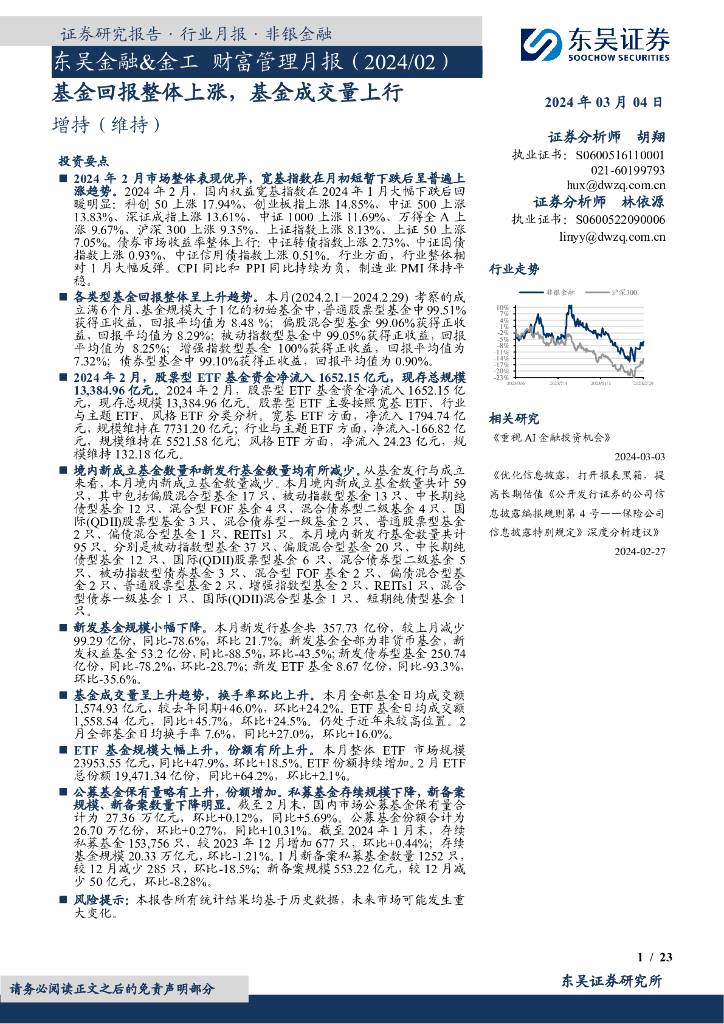 东吴证券:东吴金融&金工财富管理月报(2024/02):基金回报整体上涨,基金成交量上行.pdf