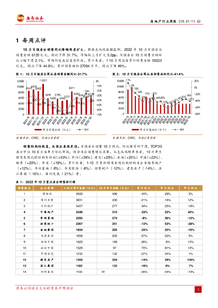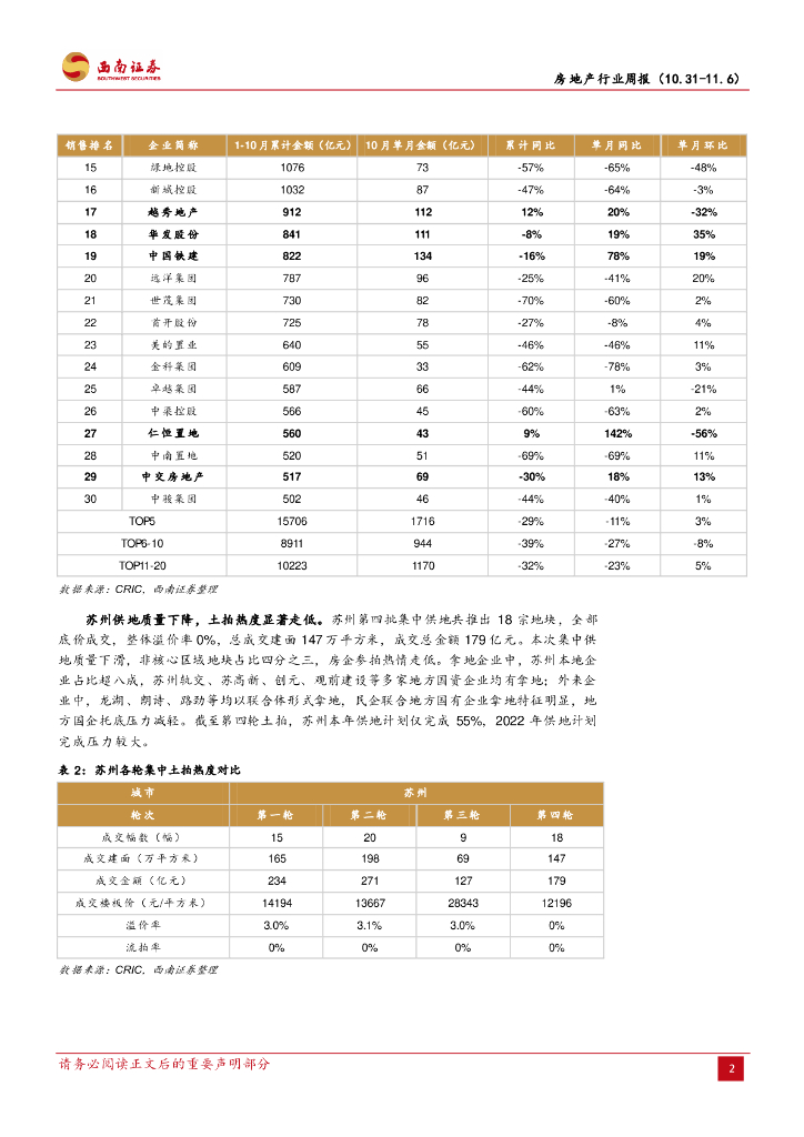 西南证券:房地产行业周报:10月百强销售降幅小幅扩大,土地市场热度走低.pdf