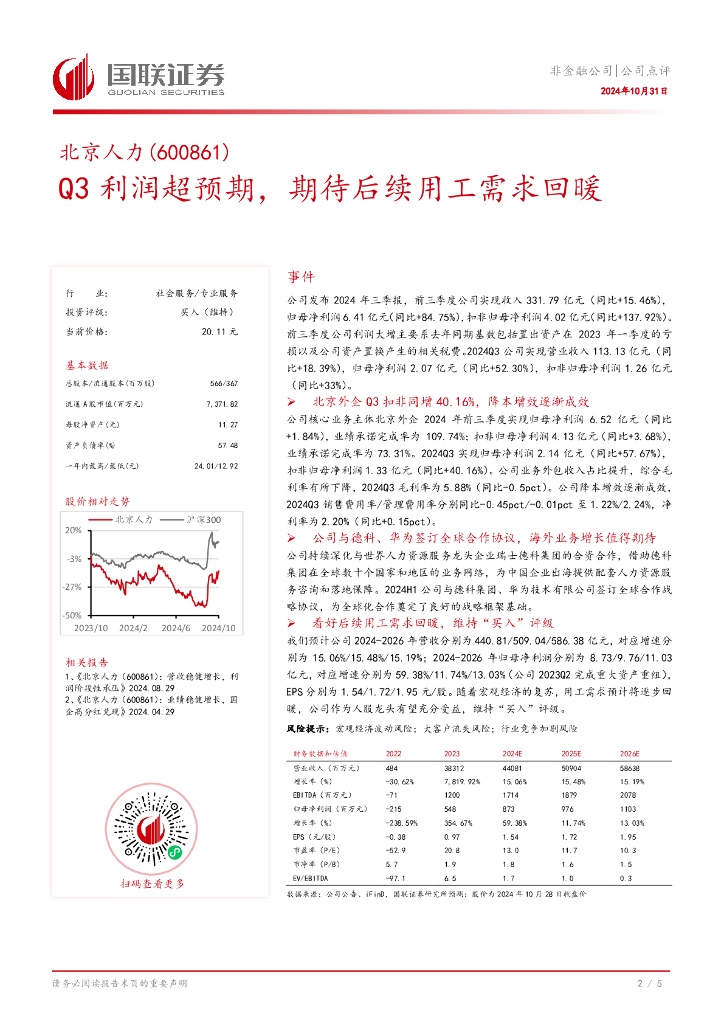 国联证券:北京人力(600861)-Q3利润超预期,期待后续用工需求回暖.pdf