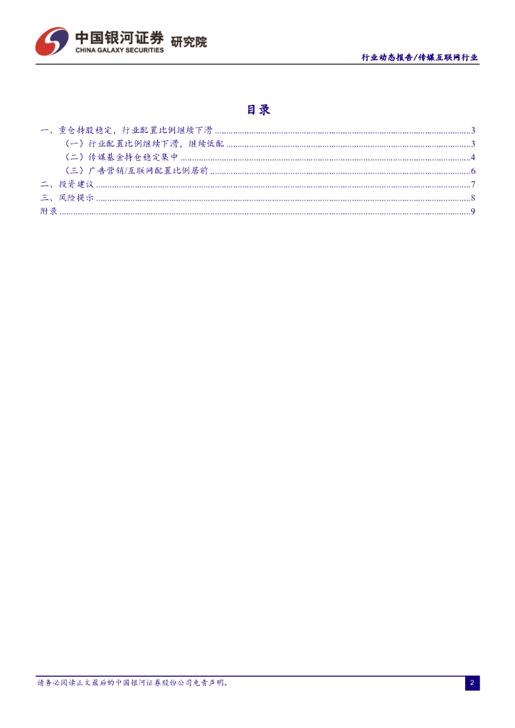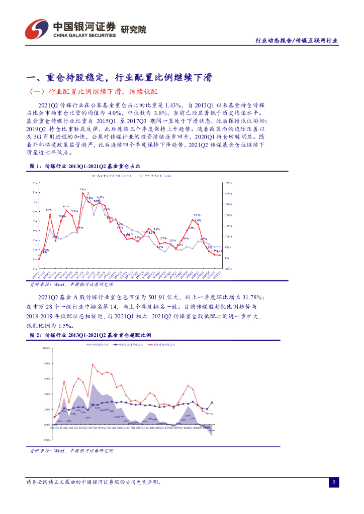 中国银河:传媒互联网行业动态报告:21Q2传媒配置降至1.43%,重仓股持续稳定.pdf