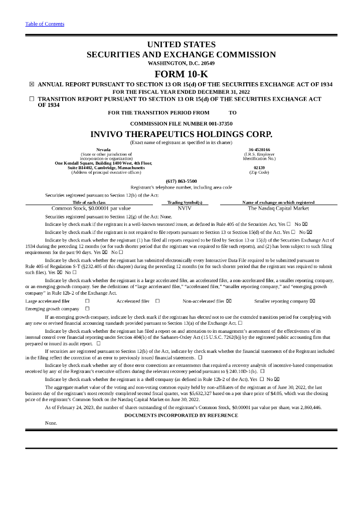 Invivo Therapeutics Holdings Corp(NVIV)2022财年年度报告(英文版).pdf