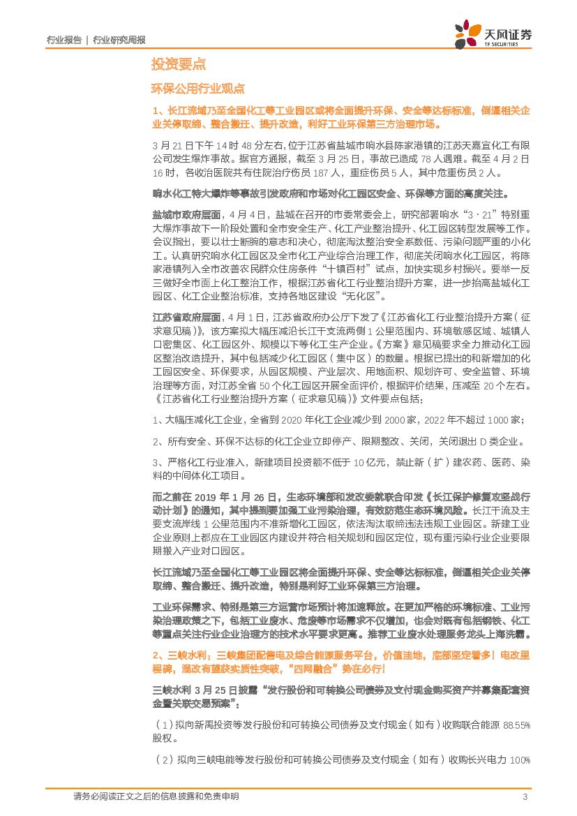 天风证券:公用事业行业研究周报:化工园区全面提升环保安全标准利好工业环保第三方治理市场;三峡水利电改里程碑,混改有望获实质性突破,“四网融合”势在必行!.pdf