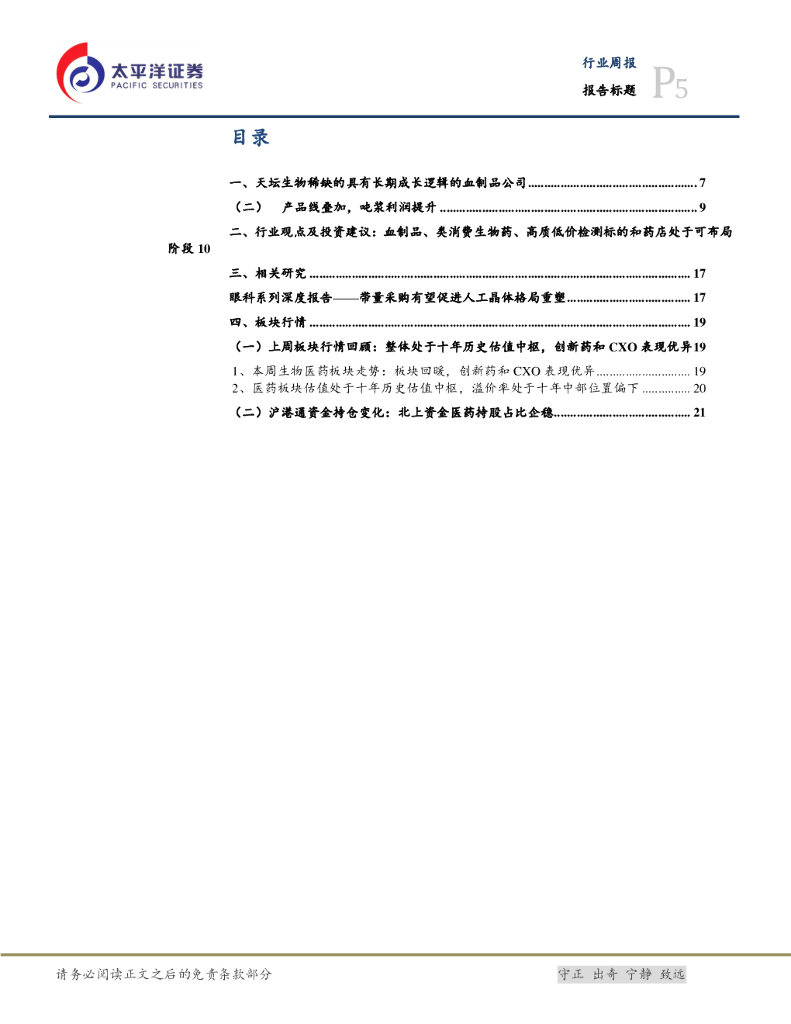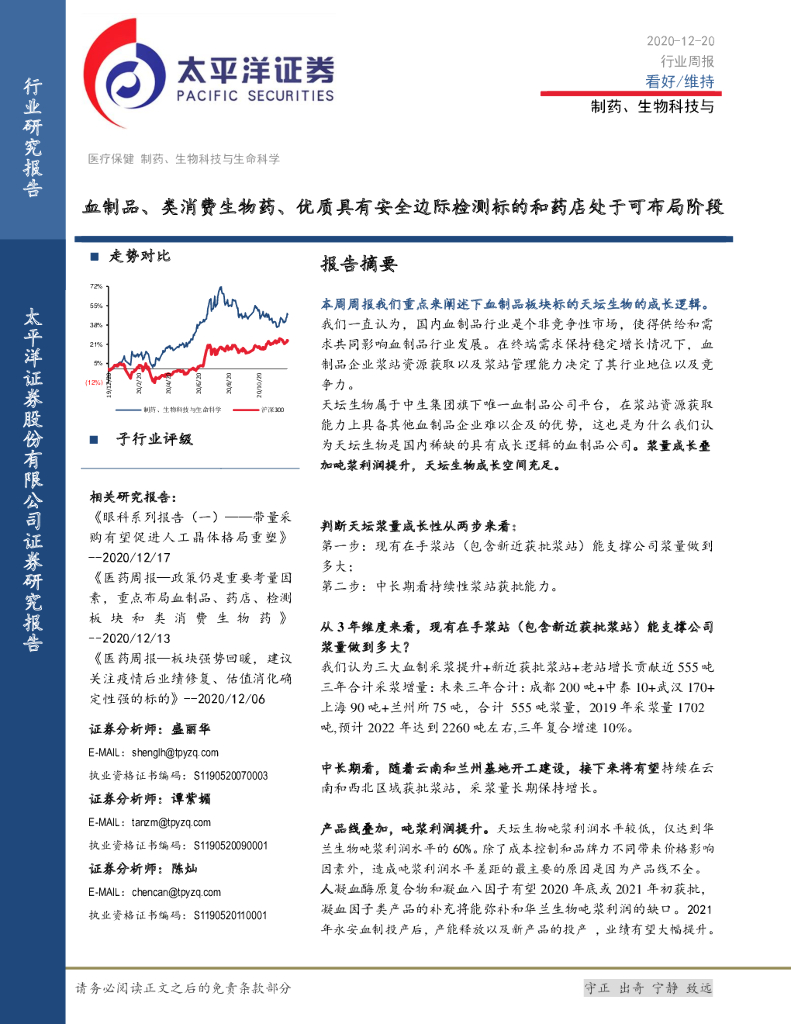 太平洋证券:制药、生物科技与行业周报:血制品、类消费生物药、优质具有安全边际检测标的和药店处于可布局阶段.pdf