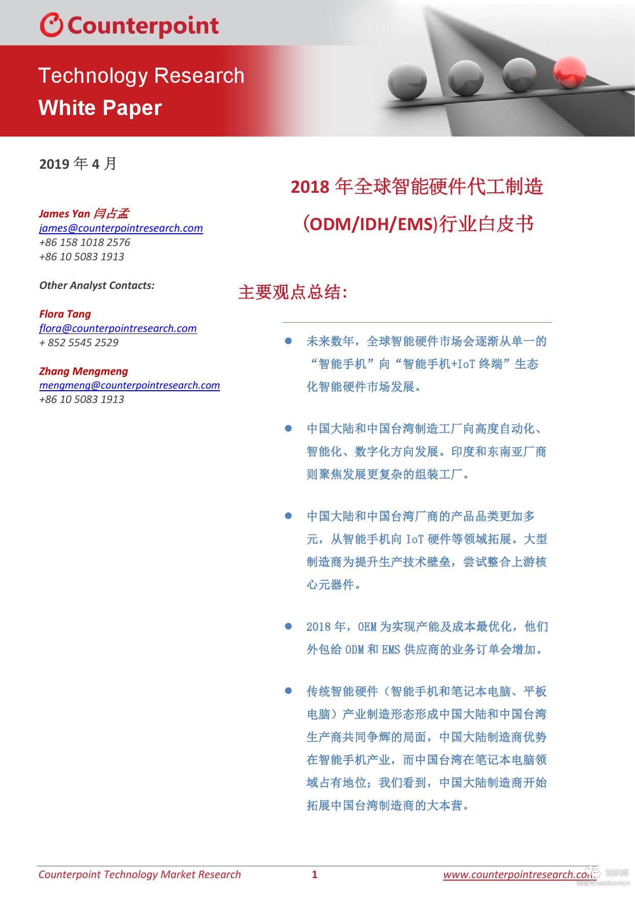 Counterpoint:2018年全球智能硬件代工制造 (ODM/IDH/EMS)行业白皮书.pdf