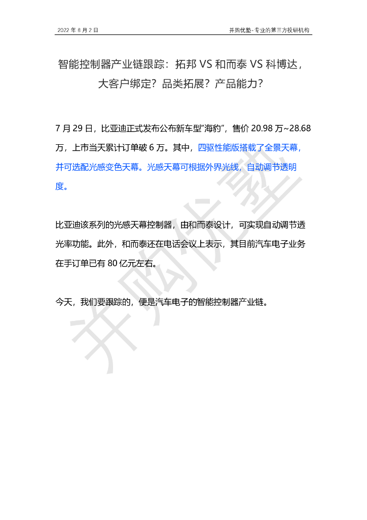 并购优塾:智能控制器产业链跟踪:拓邦VS和而泰VS科博达,大客户绑定?品类拓展?产品能力?.pdf