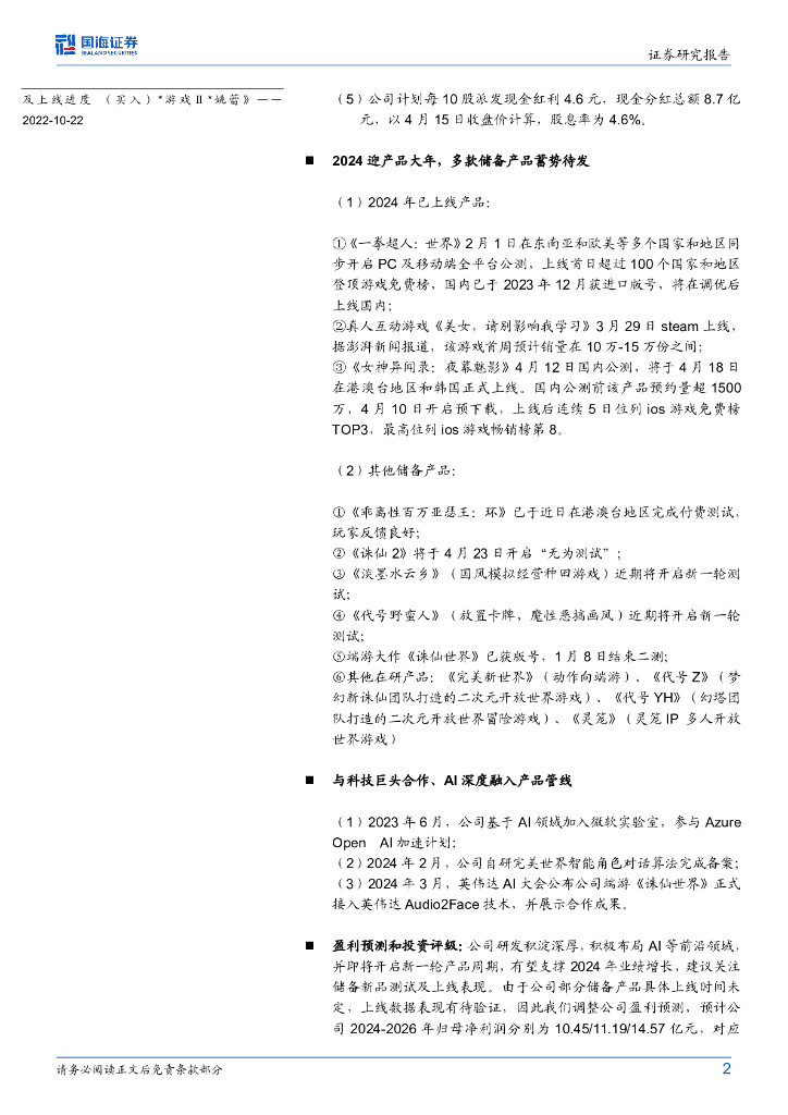 国海证券:完美世界(002624)-2023年年报点评报告:高分红彰显价值,新产品周期开启.pdf