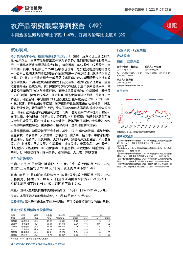 国信证券:农产品研究跟踪系列报告(49):本周全国生猪均价环比下跌1.49%,仔猪均价环比上涨0.32%.pdf