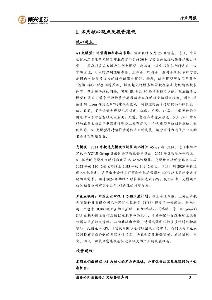 甬兴证券:通信行业周报:运营商积极参与布局AI大模型,24年光模块市场将同比增长45%.pdf
