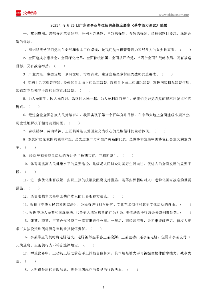 2021年9月25日广东省事业单位招聘高校应届生《基本能力测试》试题.pdf