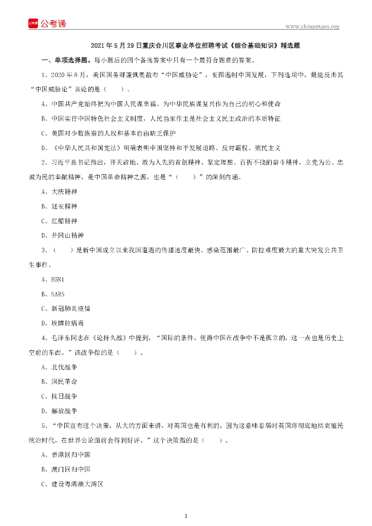 2021年5月29日重庆合川区事业单位招聘考试《综合基础知识》精选题.pdf