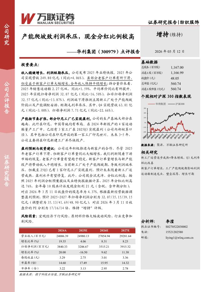 万联证券:华利集团(300979)-点评报告:产能爬坡致利润承压,现金分红比例较高.pdf