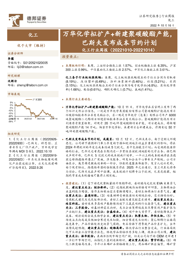 德邦证券:化工行业周报:万华化学拟扩产+新建聚碳酸酯产能,巴斯夫发布成本节约计划.pdf