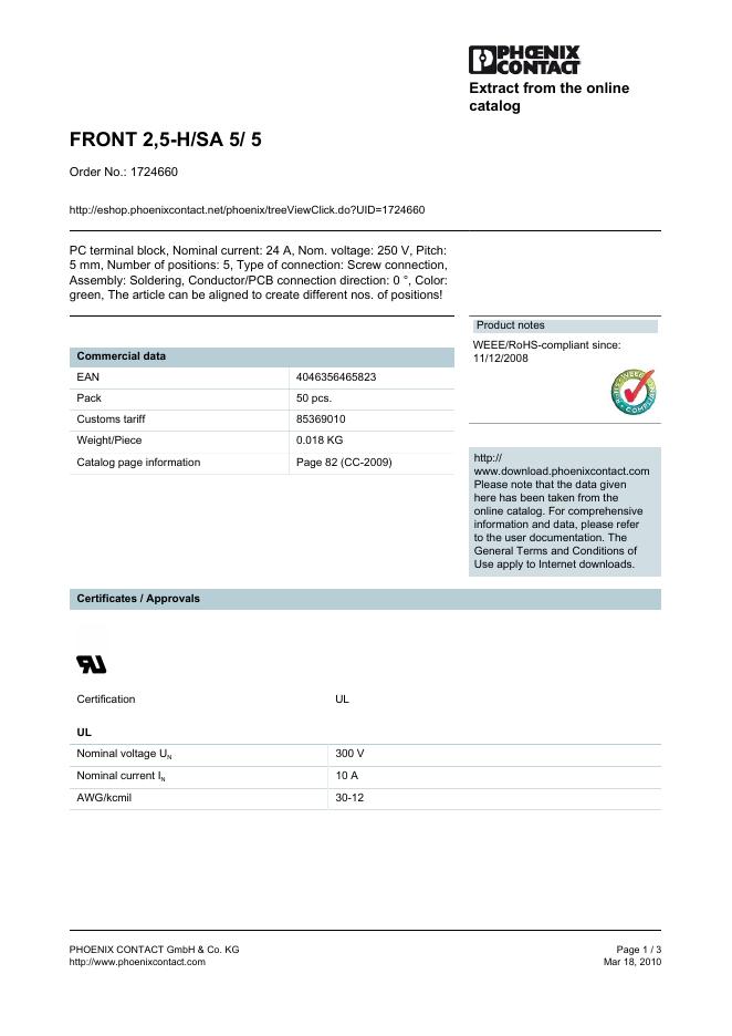 PHOENIX CONTACT FRONT 2,5-H/SA 5/ 5 Order No.: 1724660 数据手册.pdf