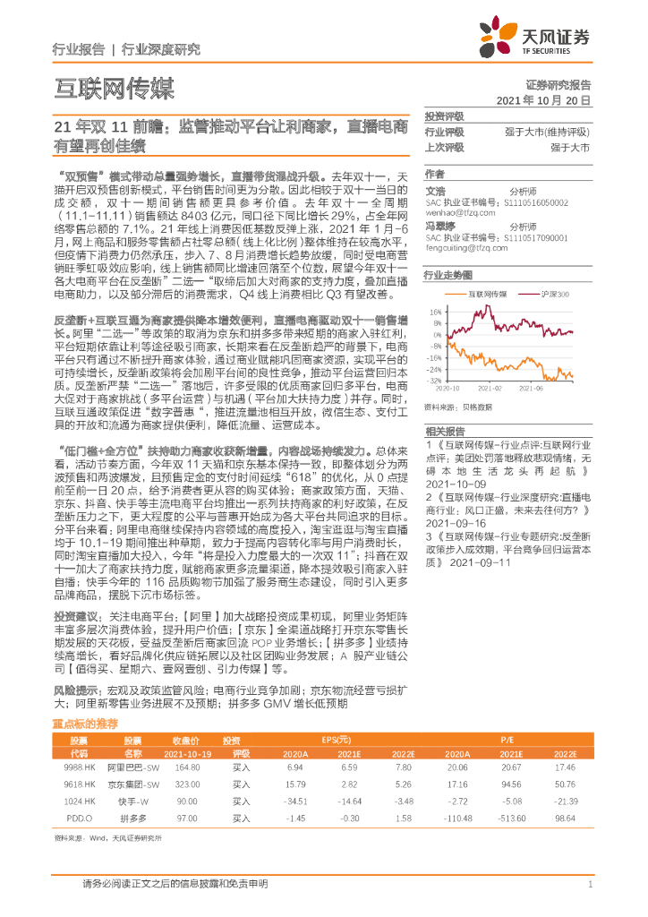天风证券:互联网传媒行业深度研究:21年双11前瞻:监管推动平台让利商家,直播电商有望再创佳绩.pdf