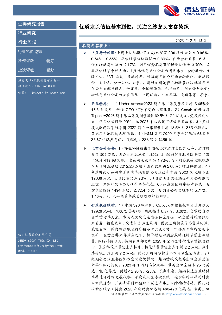 信达证券:纺织服装行业周报:优质龙头估值基本到位,关注色纱龙头富春染织.pdf