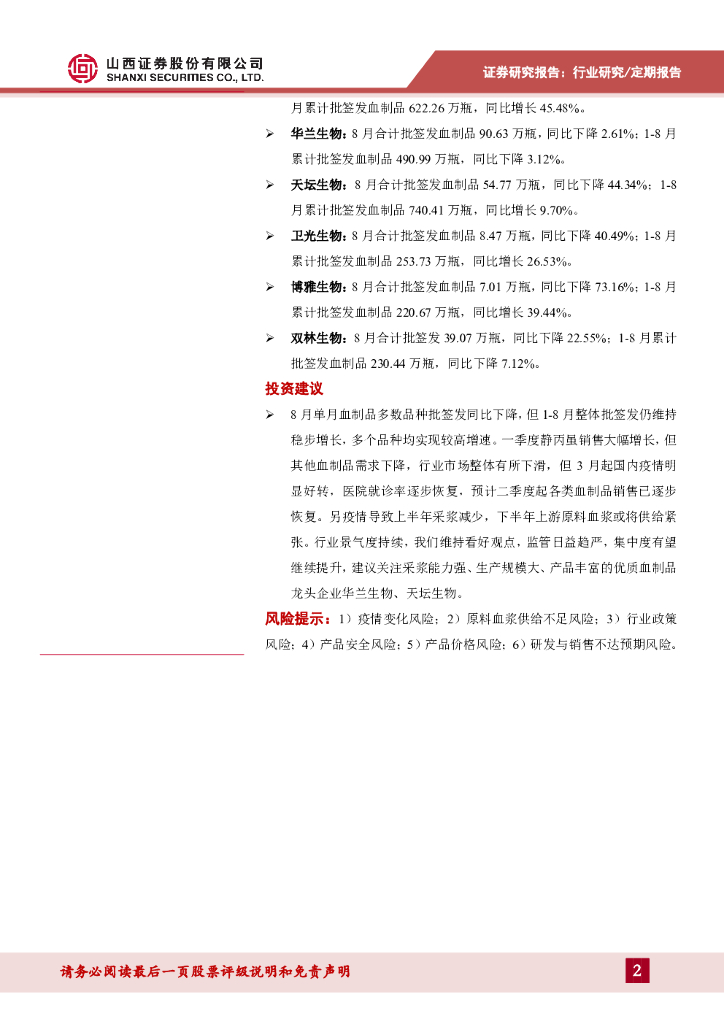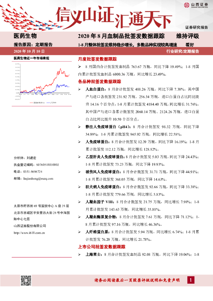 山西证券:2020年8月血制品批签发数据跟踪:1-8月整体批签发维持稳步增长,多数品种实现较高增速.pdf