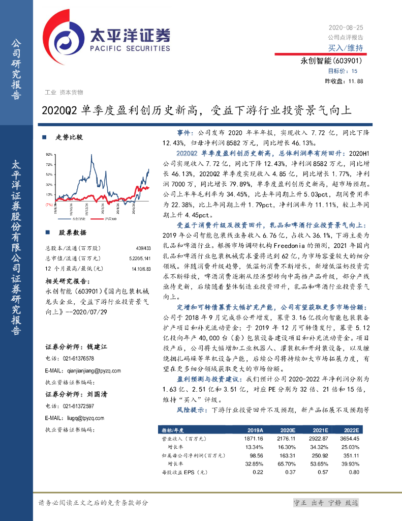 太平洋证券:永创智能(603901)-2020Q2单季度盈利创历史新高,受益下游行业投资景气向上.pdf