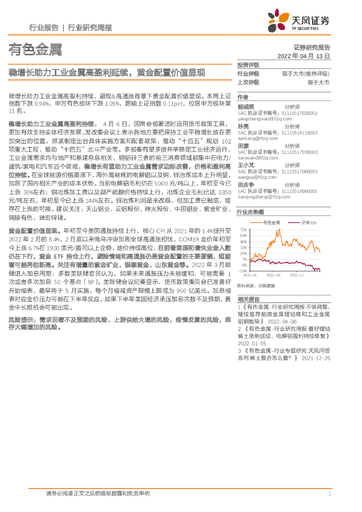 天风证券:有色金属:稳增长助力工业金属高盈利延续,黄金配置价值显现.pdf