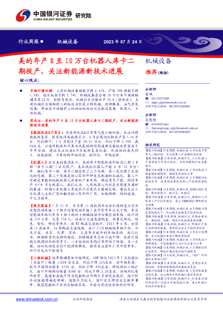 中国银河:机械设备行业周报:美的年产8至10万台机器人库卡二期投产,关注新能源新技术进展.pdf