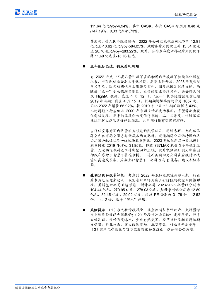 国海证券:吉祥航空(603885)-2022年报点评:三年低谷已过,拥抱景气周期.pdf