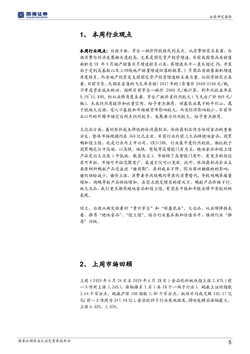 国海证券:食品饮料行业周报:茅台一批价阶段性或到高点,看好原料成本降低的休闲卤制品.pdf