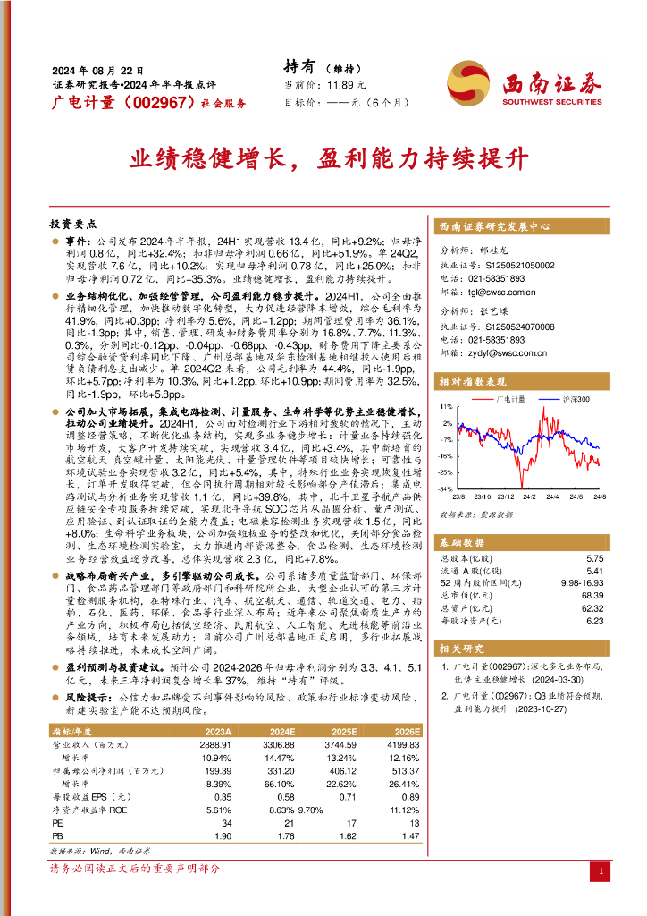 西南证券:广电计量(002967)-2024年半年报点评:业绩稳健增长,盈利能力持续提升.pdf