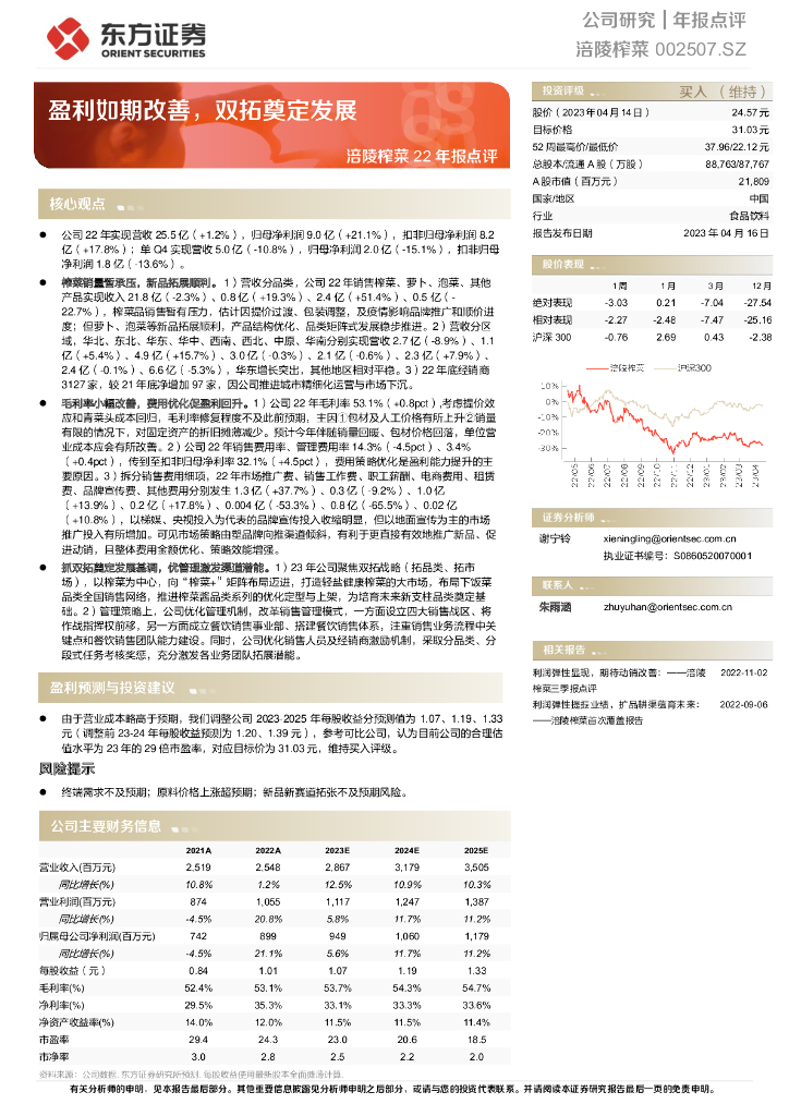 东方证券:涪陵榨菜22年报点评:盈利如期改善,双拓奠定发展.pdf