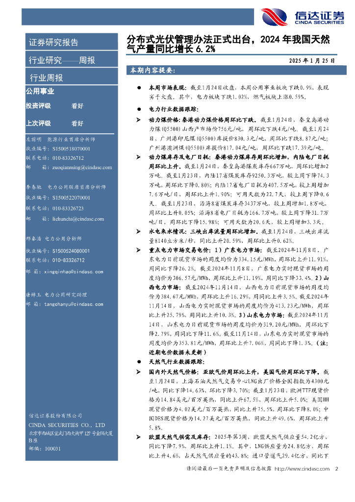 信达证券:公用事业—电力天然气周报:分布式光伏管理办法正式出台,2024年我国天然气产量同比增长6.2%.pdf