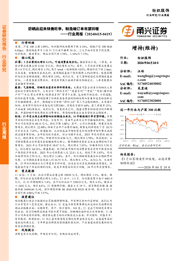 甬兴证券:纺织服饰行业周报:防晒品迎来销售旺季,制造端订单有望回暖.pdf
