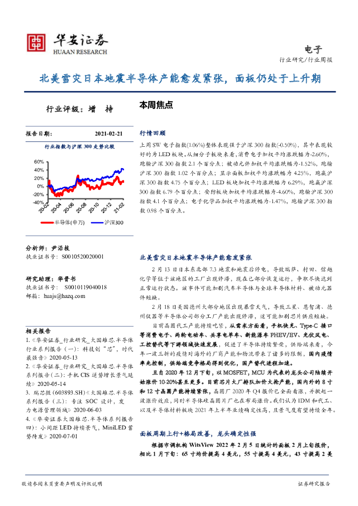 华安证券:电子行业周报:北美雪灾日本地震半导体产能愈发紧张,面板仍处于上升期.pdf