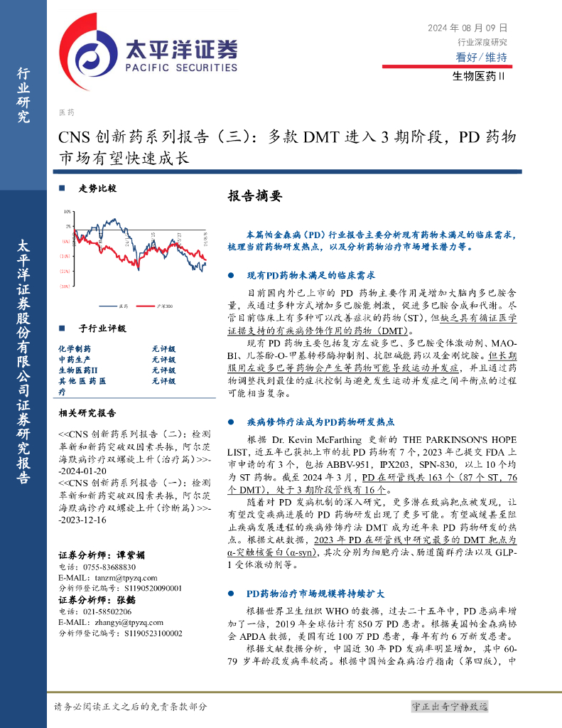 太平洋证券:CNS创新药系列报告(三):多款DMT进入3期阶段,PD药物市场有望快速成长.pdf