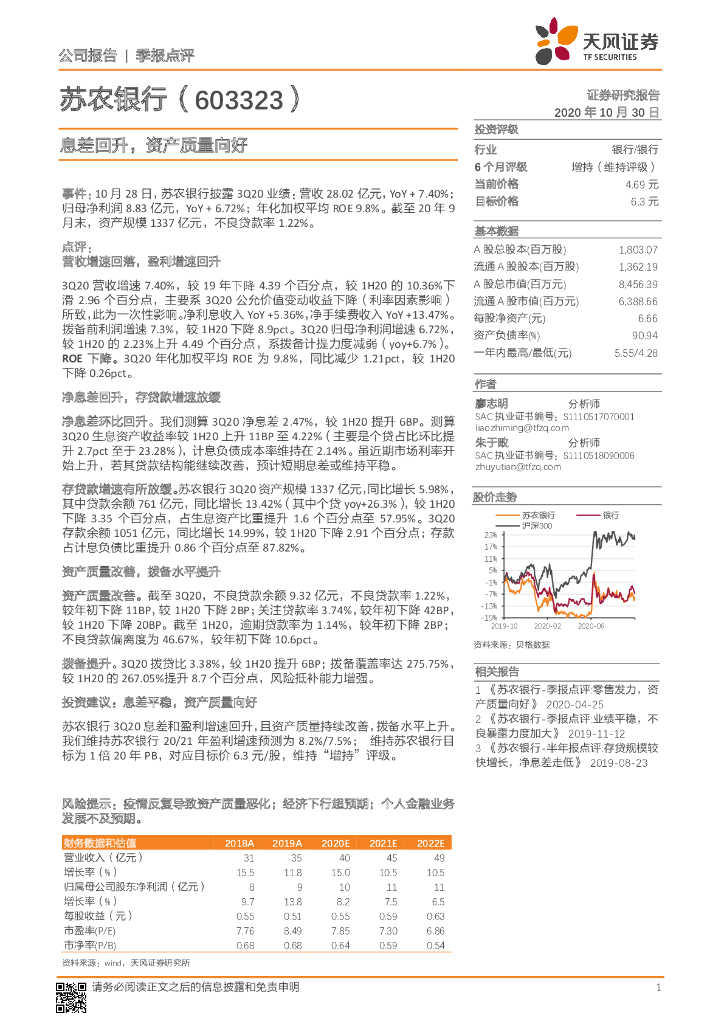天风证券:苏农银行(603323)-息差回升,资产质量向好.pdf